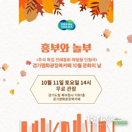 K-Classic News 기자 | 경기도가 오는 10월 11일 경기평화광장 북카페 원형무대에서 추석 연휴를 맞아 전래동화 인형극 공연 ‘흥부와 놀부’를 공연한다. 이번 행사는 ‘10월 문화의 날’ 프로그램으로, 도민에게 명절의 의미를 되새기고 가족과 함께하는 특별한 시간을 제공하기 위해 기획됐다.