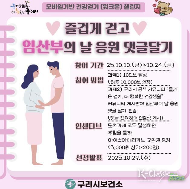 K-Classic News 기자 | 구리시는 제20회‘임산부의 날’(10월 10일)을 기념해 임신과 출산의 가치를 되새기고 시민 건강 증진을 도모하기 위한 ‘즐겁게 걷고, 임산부의 날 응원 댓글 달기’ 챌린지를 오는 10월 10일부터 24일까지 15일간 운영한다고 밝혔다.