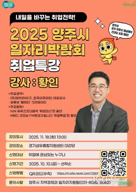 양주시 관계자는 “이번 특강은 청년층은 물론 중장년 구직자까지 모두에게 도움이 될 수 있는 실전 취업 전략을 다룰 예정”이라며 “많은 시민들이 참여해 취업 경쟁력을 높이는 기회가 되길 바란다”고 전했다.