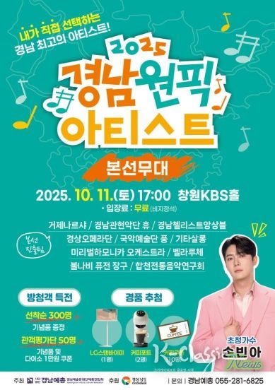 K-Classic News 기자 | 경상남도는 도내 우수 공연예술인과 단체를 발굴하고 지속적인 활동 기회를 제공하기 위한 오디션형 공연 프로그램 ‘경남 원픽 아티스트’의 결선 무대를 10월 11일 오후 5시, 창원KBS홀에서 개최한다.