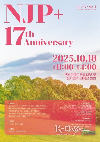 K-Classic News 기자 | 경기문화재단 백남준아트센터(NJP, 관장 박남희)는 2025년 10월 18일, 개관 17주년 기념 축제 'NJP+'를 연다. 특히 이번 행사는 백남준아트센터와 경기도박물관, 경기도어린이박물관으로 이어지는 산책로 환경개선과 맞물려 축하의 의미를 더하고 있다. 아트센터는 올해 시민 예술 교육프로그램인 ‘퍼블릭 아카데미’ 운영, 지역 연계 협력 축제인 ‘제8회 머내마을영화제’ 공동체 상영관 참여, 유휴부지에 공유 정원을 조성하는 ‘이키로(2km) 정원행동 캠페인’ 등 지역과 환경을 잇는 새로운 고객서비스 프로그램을 기획·추진하고 있다.