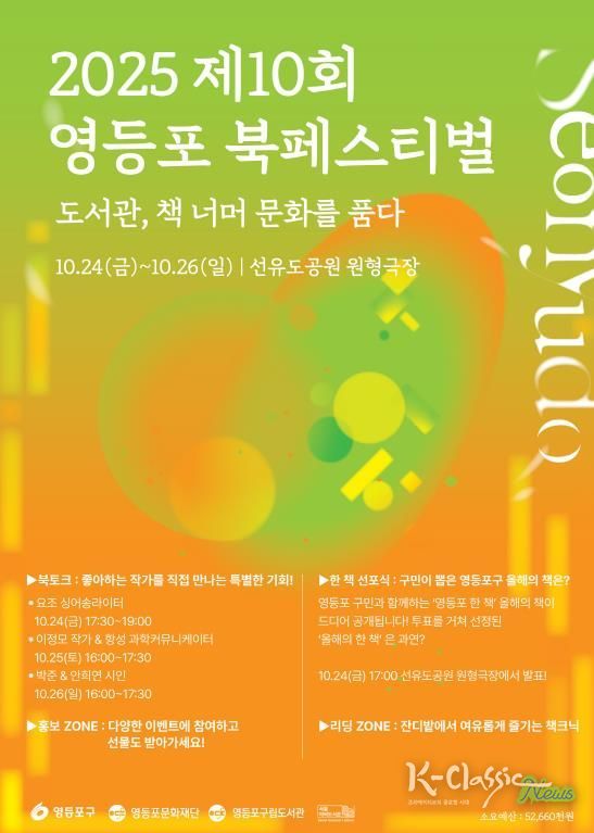 한편 오는 10월 24일부터 26일까지 선유도공원에서 ‘제10회 영등포 북페스티벌’이 열린다. 이번 축제는 영등포 대표 지역축제인 ‘선유도원 축제’와 연계해 진행되며, 선선한 가을 바람 속에서 특별한 독서의 즐거움을 느낄 수 있다. 자세한 사항은 구청 미래교육과 또는 영등포구립도서관으로 문의하면 된다.