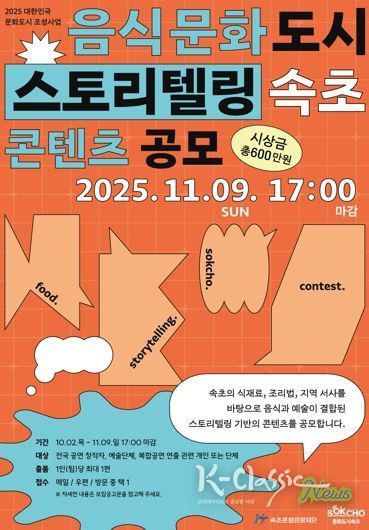 K-Classic News 기자 | 재단법인 속초문화관광재단은 속초의 대표 음식문화 콘텐츠로 자리매김할 ‘음식문화도시 속초 스토리텔링 콘텐츠’ 공모를 개최한다.