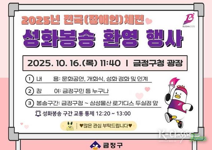 K-Classic News 기자 | 부산시 금정구는 오는 10월 16일 제106회 전국체육대회 및 제45회 전국장애인체육대회의 성공적인 개최를 위한 성화봉송 환영 행사를 개최한다고 밝혔다.