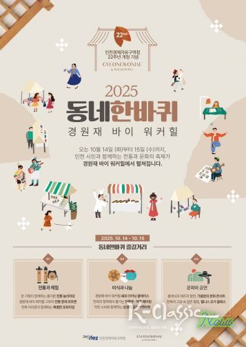 K-Classic News 기자 | 인천경제자유구역청은 오는 14일과 15일 이틀간 경원재 한옥호텔에서 제2회 경원재 시민페스티벌 ‘2025 동네한바퀴 경원재바이워커힐’을 개최한다고 밝혔다.