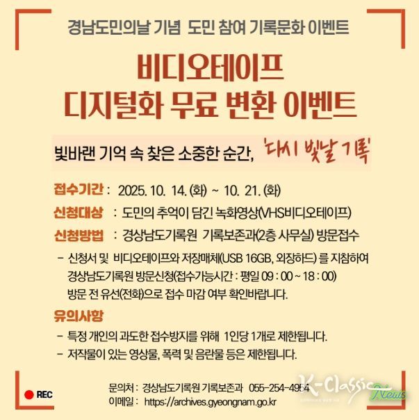 K-Classic News 기자 | 경상남도기록원은 10월 14일부터 31일까지 도민이 소중한 추억을 오래도록 보존할 수 있도록 '빛바랜 기록 속 찾은 소중한 순간 – 다시 빛날 기록'이라는 주제로 비디오테이프 디지털 변환 이벤트를 추진한다고 밝혔다.