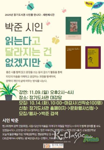 K-Classic News 기자 | 김포시 장기도서관은 2025년 공공도서관 독서프로그램 운영 지원사업으로 '시인을 만나다-박준 시인'을 오는 11월 9일, 오후 2시부터 4시까지 장기도서관 대강당에서 운영한다고 밝혔다