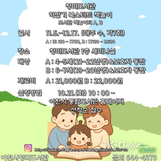 K-Classic News 기자 | 이천시 청미도서관은 오는 11월 5일부터 12월 17일까지, 유아와 보호자를 대상으로 ‘하반기 북스타트 책놀이’ 프로그램을 운영한다.