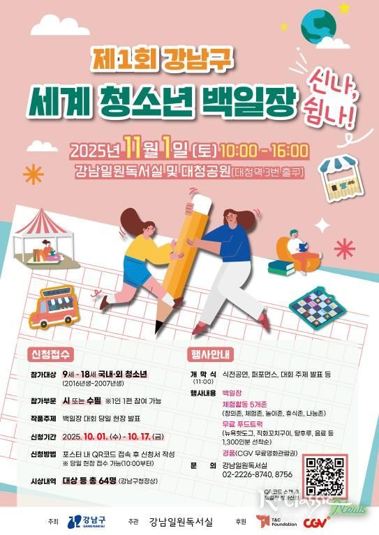 K-Classic News 기자 | 꿈이 모이는 도시, 미래를 그리는 강남구가 오는 11월 1일 오전 10시부터 오후 4시까지 강남일원독서실과 대청공원 일대에서 ‘제1회 강남구 세계청소년백일장 신나, 쉼나!’를 개최한다. 이 행사는 국내‧외 국적 청소년이 함께하는 전국 최초의 기초지자체 주관 백일장으로, 다문화 시대와 K-컬처 확산 흐름에 발맞춘 문학축제다.