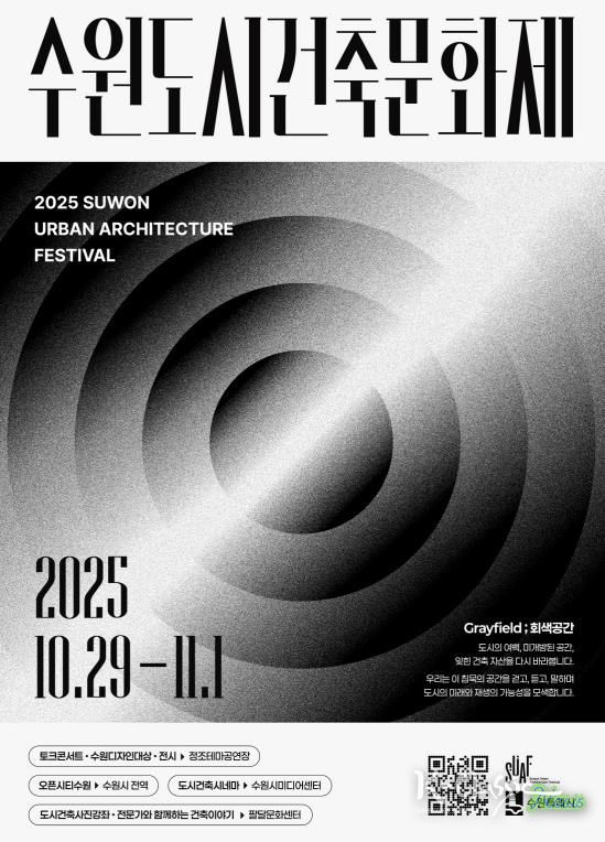 수원시 관계자는 “2025 수원도시건축문화제가 전통과 현대가 조화되는 도시 정체성을 확장하고, 수원의 건축문화가 한 단계 성장하는 계기가 되길 바란다”며 “많은 시민이 문화제에 참여해 도시를 새롭게 바라보고, 평소 접근하기 어려웠던 공간을 탐방하길 바란다”고 덧붙였다.