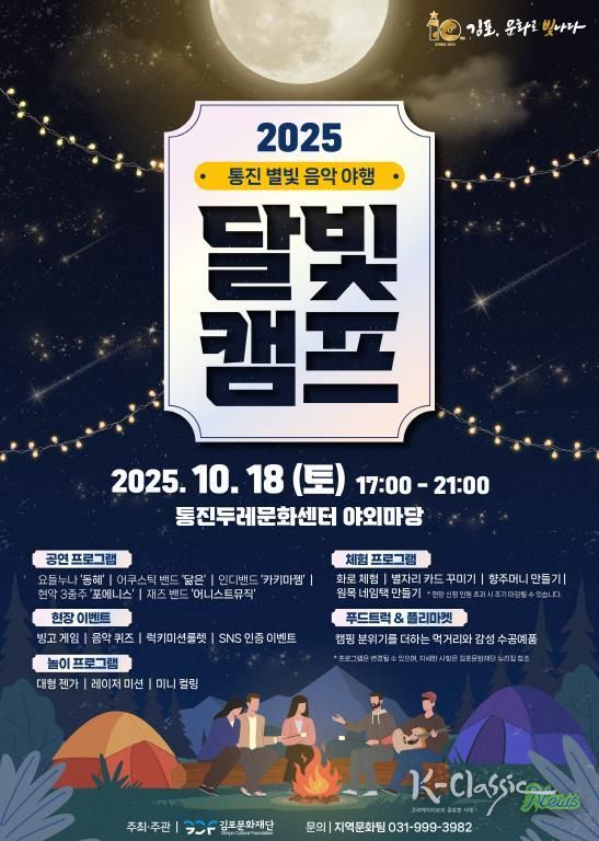 K-Classic News 기자 | (재)김포문화재단이 주관하는 2025 통진별빛음악야행 '달빛캠프'가 10월 18일 17시부터 통진두레문화센터 야외마당에서 개최된다.