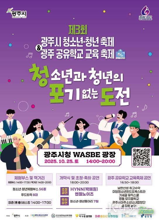 K-Classic News 기자 | 광주시는 오는 25일 오후 2시부터 8시까지 시청 WASBE 광장에서 ‘제3회 광주시 청소년·청년 축제 청·포·도 · 광주 공유학교 교육 축제’를 개최한다고 14일 밝혔다.