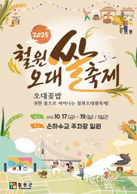 K-Classic News 기자 | 철원군은 10월 17일부터 19일까지 3일간 철원군 동송읍 장흥리 2721번지 은하수교 주차장 일원에서 『2025 철원오대쌀 축제』를 개최한다.