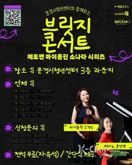 K-Classic News 기자 | 문경시청년센터는 오는 10월부터 12월까지 문경시청년센터 3층 라운지에서 클래식을 주제로 한‘브릿지 콘서트’를 연다.