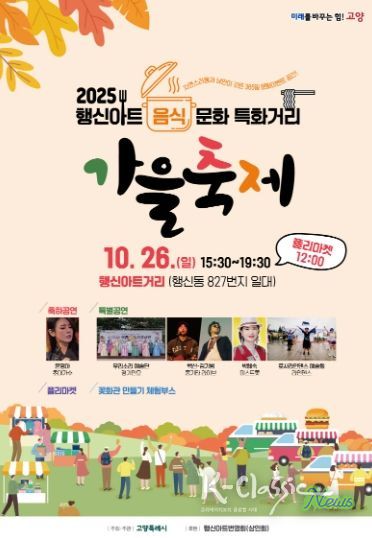 K-Classic News 기자 | 고양특례시는 오는 26일 오후 3시 30분부터 오후 7시 30분까지 ‘행신아트 음식문화 특화거리 가을축제’를 행신아트거리 일대에서 개최한다고 밝혔다.