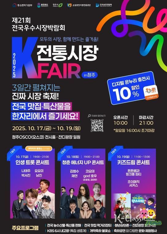 K-Classic News 기자 | 청주시는 ‘2025 전국 우수시장 박람회(K-전통시장 페어 in 청주)’가 오는 17일부터 19일까지 3일간 청주오스코에서 개최된다고 밝혔다.