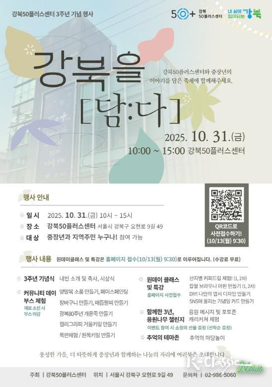 K-Classic News 기자 | 서울 강북구는 오는 10월 31일 오전 10시부터 오후 3시까지 강북50플러스센터에서 개관 3주년을 기념하는 축제 ‘강북을 [담:다]’가 개최된다고 밝혔다.