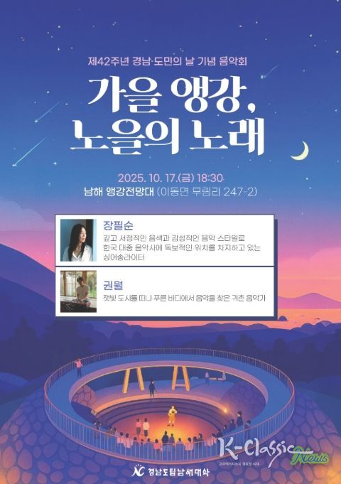 K-Classic News 기자 | 경남도립남해대학은 17일 저녁 6시 30분, 남해 앵강전망대에서 지역민과 함께하는 가을음악회 ‘가을 앵강, 노을의 노래’를 개최한다.