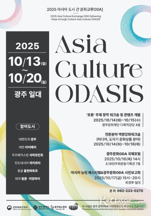 K-Classic News 기자 | 광주광역시는 17일 오후 5시30분 동구 희경루 야외공연장에서 아시아 도시 간 문화교류 협력사업인 ‘광주형 문화 공적개발원조(ODA)-아시아 컬쳐 오다시스(Asia Culture ODASIS) 시민 성과보고회’를 개최한다.