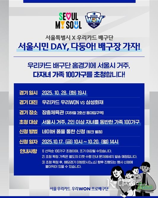 K-Classic News 기자 | 서울시가 ‘서울시민의 날(10월 28일)’을 맞아 28일 저녁 7시 장충체육관에서 열리는 서울시 연고 구단 ‘우리카드배구단’의 홈경기에 다자녀 100가족을 무료 초청하는 ‘서울시민 데이’를 진행한다.