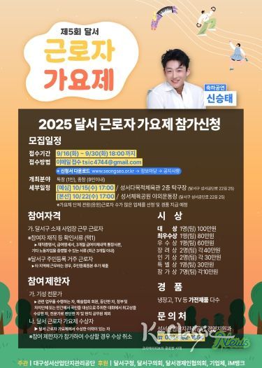 K-Classic News 기자 | 대구 달서구는 10월 22일 오후 4시, 성서산업단지 내 성서체육공원 야외운동장(월암동)에서 『제5회 달서 근로자 가요제』를 개최한다.