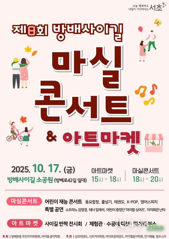 K-Classic News 기자 | 서울 서초구는 오는 17일 방배로42길에 위치한 방배사이길 소공원에서 '제8회 방배사이길 마실콘서트·아트마켓'을 개최한다고 밝혔다.