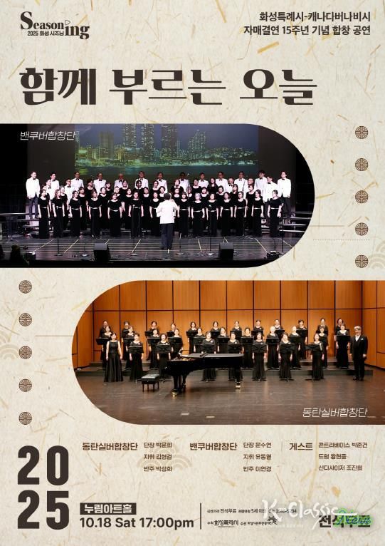 K-Classic News 기자 | 화성시문화관광재단과 화성시는 캐나다 버나비시의 자매결연 15주년을 기념하는 합창공연 '함께 부르는 오늘'을 오는 10월 18일 누림아트홀에서 개최한다. 이번 공연은 화성시와 캐나다 버나비시의 문화교류를 위해 마련한 자리로, 각 도시를 대표하는 동탄실버합창단과 밴쿠버합창단이 한 무대에 오른다.