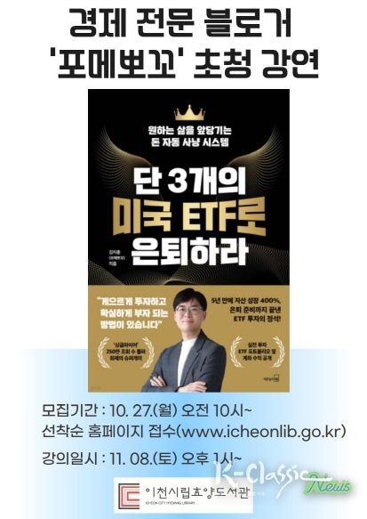 K-Classic News 기자 | 이천시 효양도서관은 시민들의 경제적 이해력 향상과 현명한 자산 관리 능력 제고를 위해 오는 11월 8일 오후 1시, '단 3개의 미국 ETF로 은퇴하라'의 저자이자 네이버 경제 전문 블로거 김지훈(필명 포메뽀꼬)을 초청해 재테크 특강을 진행한다.