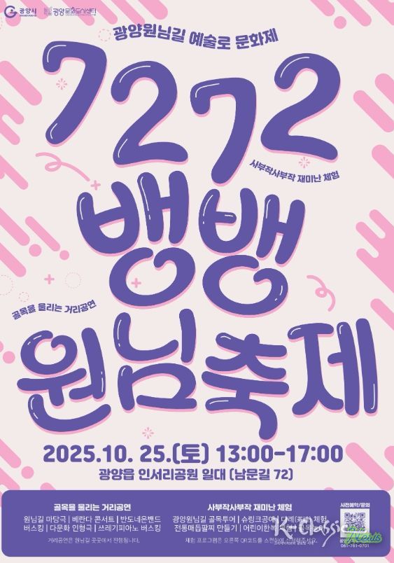 K-Classic News 기자 | 광양문화도시센터는 오는 10월 25일 금요일 오후 광양읍 인서리공원 일대에서 광양원님길 브랜드 축제 ‘7272뱅뱅원님축제’를 개최한다고 밝혔다.