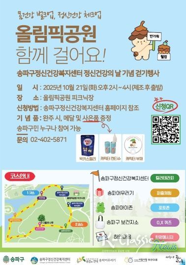 K-Classic News 기자 | 완연한 가을을 맞아, 서울 송파구가 오는 21일 오후 2시 올림픽공원 일대에서 정신건강의 날 기념 걷기 행사 ‘몸건강 벌크업, 정신건강 체크업’을 개최한다고 알렸다.