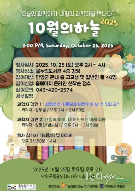 K-Classic News 기자 | 충북 단양군립올누림도서관은 오는 25일 오후 2시부터 4시까지 과학자들의 재능기부로 진행되는 ‘10월의 하늘’ 과학 행사를 운영한다고 밝혔다.
