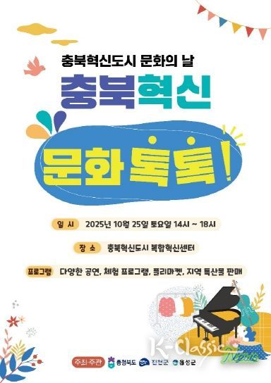 K-Classic News 기자 | 충북도는 오는 10월 25일 충북혁신도시 복합혁신센터 잔디광장에서 혁신도시 지역 주민들이 다양한 공동체 문화를 공유하고 소통할 수 있는 계기를 마련하고자 ‘2025년 충북혁신도시 문화의 날’ 행사를 개최한다고 20일 밝혔다.