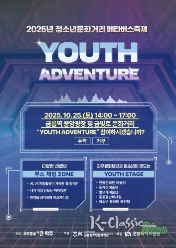 K-Classic News 기자 | (재)파주시청소년재단 금촌청소년문화의집은 오는 2025년 10월 25일 토요일 금릉역 중앙광 및 금빛로 문화거리 일대에서 2025년 청소년문화거리메타버스축제 ‘YOUTH ADVENTURE’를 개최한다고 밝혔다.