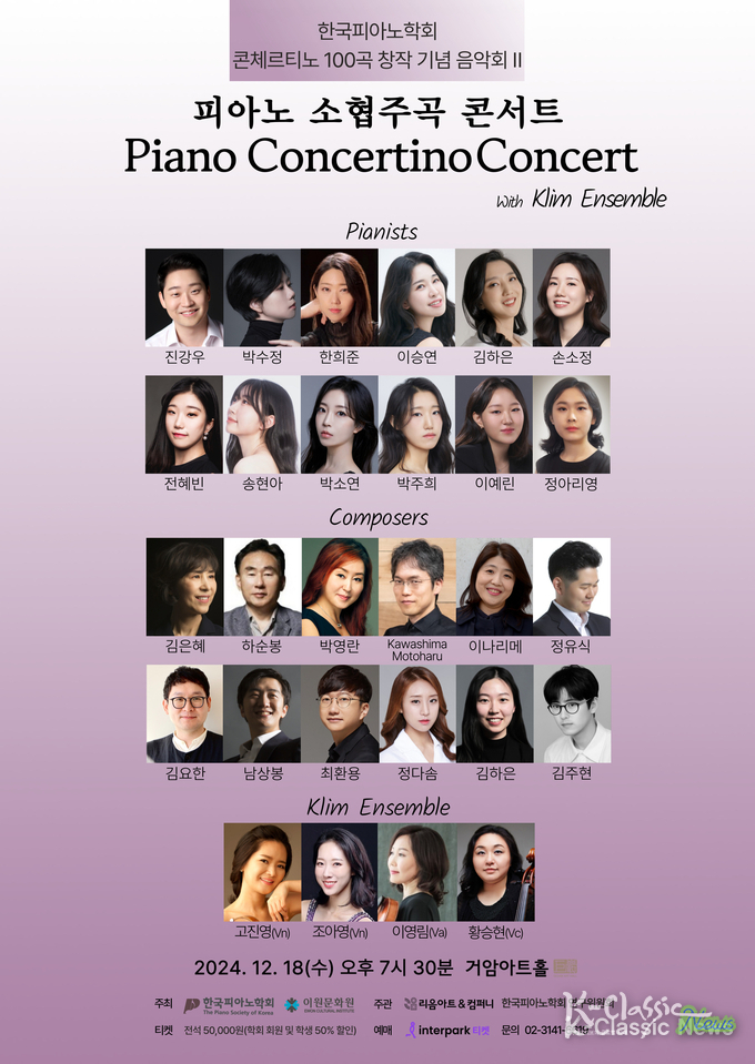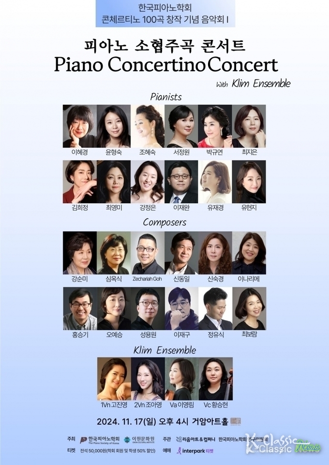 2022년부터는 본 학회가 “Concertino Project”를 기획하여 피아노와 현악 사중주를 위한 소협주곡 활성화 운동을 시작했습니다. 이것은 새로운 시도의 공연 모델로 제시되었고 지난해까지 국내와 해외 여러 나라 작곡가들의 적극적인 협조로 이미 100곡의 새로운 작품을 연주·발표하였으며 크나큰 호응을 얻었습니다.