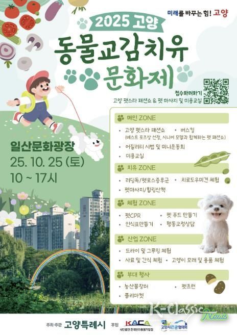 K-Classic News 기자 | 고양특례시는 오는 25일 일산문화광장에서, 반려동물과 사람이 함께하는 특별한 축제‘2025 고양 동물교감치유 문화제’를 개최한다고 밝혔다.