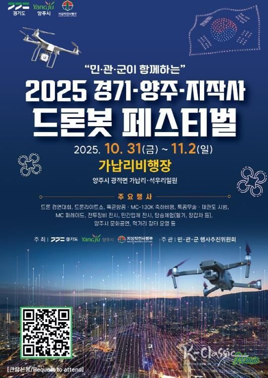 K-Classic News 기자 | 경기도와 양주시, 지상작전사령부가 오는 31일부터 11월 2일까지 3일간 가납리비행장 일원에서 '2025 경기ㆍ양주ㆍ지작사 드론봇 페스티벌'을 개최한다.