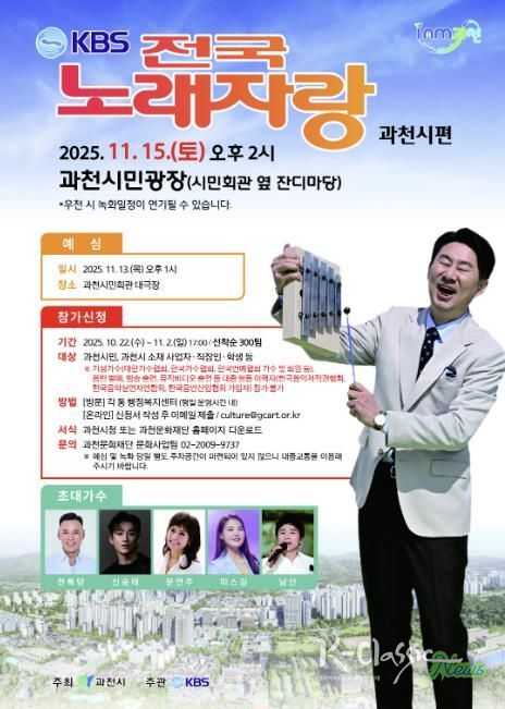 K-Classic News 기자 | 과천시는 대한민국 대표 장수 프로그램 KBS1TV ‘전국노래자랑’이 오는 11월 15일, 과천시민광장에서 공개녹화를 진행한다고 밝혔다. 이번 행사는 7년 만에 과천에서 열려, 시민들에게 특별한 추억을 선사할 것으로 기대된다.