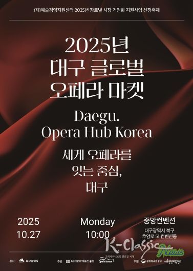 K-Classic News 기자 | (재)대구문화예술진흥원 대구오페라하우스는 문화체육관광부와 예술경영지원센터가 추진하는‘2025 장르별 시장 거점화 지원사업’에 선정돼, 오는 10월 27일 중앙컨벤션홀(대구 북구 호암로 51)에서 ‘2025 대구 글로벌 오페라 마켓’을 개최한다.