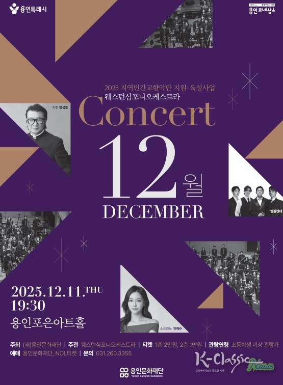 K-Classic News 기자 | 용인문화재단은 오는 12월 11일 오후 7시 30분, 용인포은아트홀에서 웨스턴심포니오케스트라 '콘서트 ‘12월’' 공연을 개최한다.