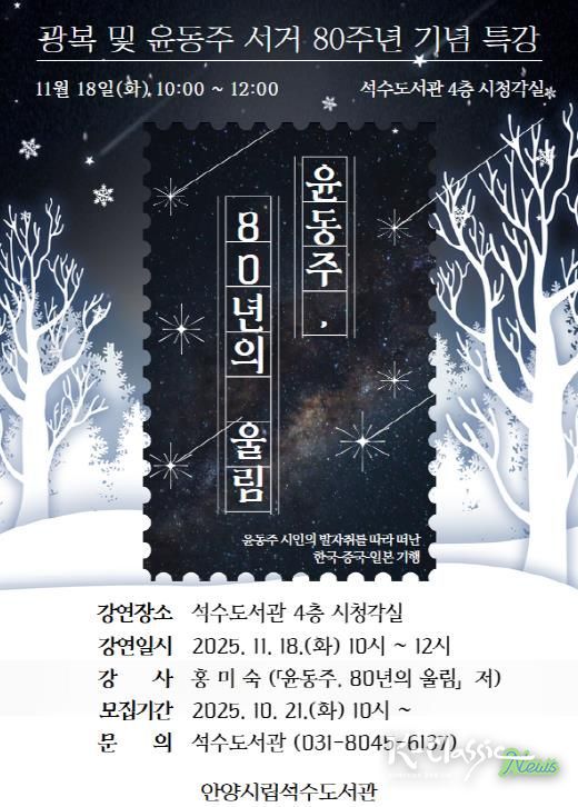 K-Classic News 기자 | 안양시 석수도서관은 광복 및 윤동주 서거 80주년을 맞이하여 11월 18일 화요일 오전 10시에 ‘윤동주, 80년의 울림’이라는 제목으로 특강을 운영한다고 23일 밝혔다.