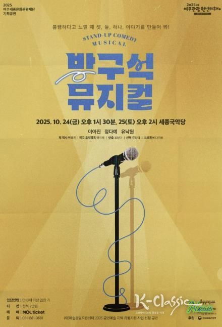 K-Classic News 기자 | 여주세종문화관광재단이 오는 10월 24일~25, 양일간 예술경영지원센터의 공모사업인 '공연예술 지역 유통지원 사업'의 일환으로 뮤지컬‘방구석 뮤지컬’을 세종국악당에서 개최한다.
