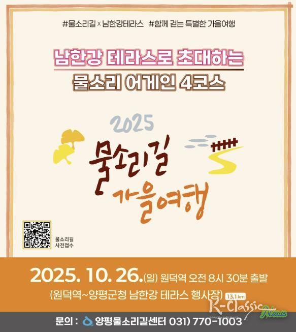 K-Classic News 기자 | 양평군은 오는 10월 26일 ‘물소리길 어게인 4코스’에서 물소리길 걷기 행사를 개최한다고 밝혔다. 이번 행사는 출발지인 원덕역을 시작으로 양평군청 앞 남한강테라스 행사장까지 이어진다.