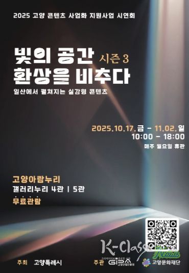 K-Classic News 기자 | 고양산업진흥원이 고양아람누리 갤러리누리에서 실감형 콘텐츠 전시 ‘빛의 공간 환상을 비추다 시즌3’를 선보이고 있다. 지난 17일부터 시작된 전시는 11월 2일까지 갤러리누리 4관과 5관에서 운영되며, 누구나 무료로 관람이 가능하다.