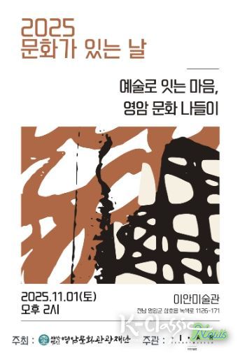 K-Classic News 기자 | (재)영암문화관광재단은 오는 11월 1일 오후 2시, 이안미술관(대표 박경곤)에서 지역민과 함께하는 예술 체험 프로그램‘예술로 잇는 마음, 영암 문화나들이’를 개최한다.