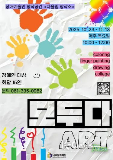 나주문화재단(이사장 윤병태)은 장애 예술인의 자립 기반 마련과 사회적 인식 개선을 목표로 오는 11월 13일까지 매주 목요일 ‘다울림 창작소’에서 미술창작 프로그램 ‘모두다ART’를 진행한다고 30일 밝혔다.
