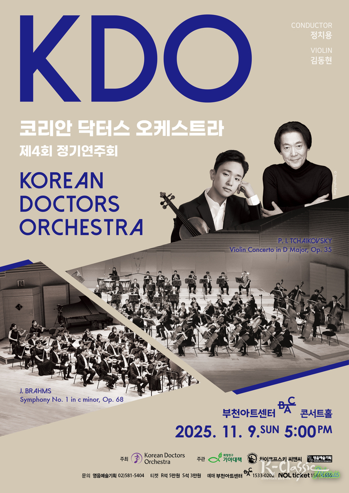 대한민국 의사와 치과의사들로 구성된 특별한 오케스트라, 코리안 닥터스 오케스트라(Korean Doctors Orchestra, 이하 KDO)가 오는 11월 9일 부천아트센터 콘서트홀에서 제4회 정기연주회를 개최한다. 이번 무대는 국내 정상급 지휘자 정치용이 지휘봉을 잡고, 세계 무대에서 주목받는 바이올리니스트 김동현이 협연자로 나서 풍성한 클래식의 향연을 펼친다.