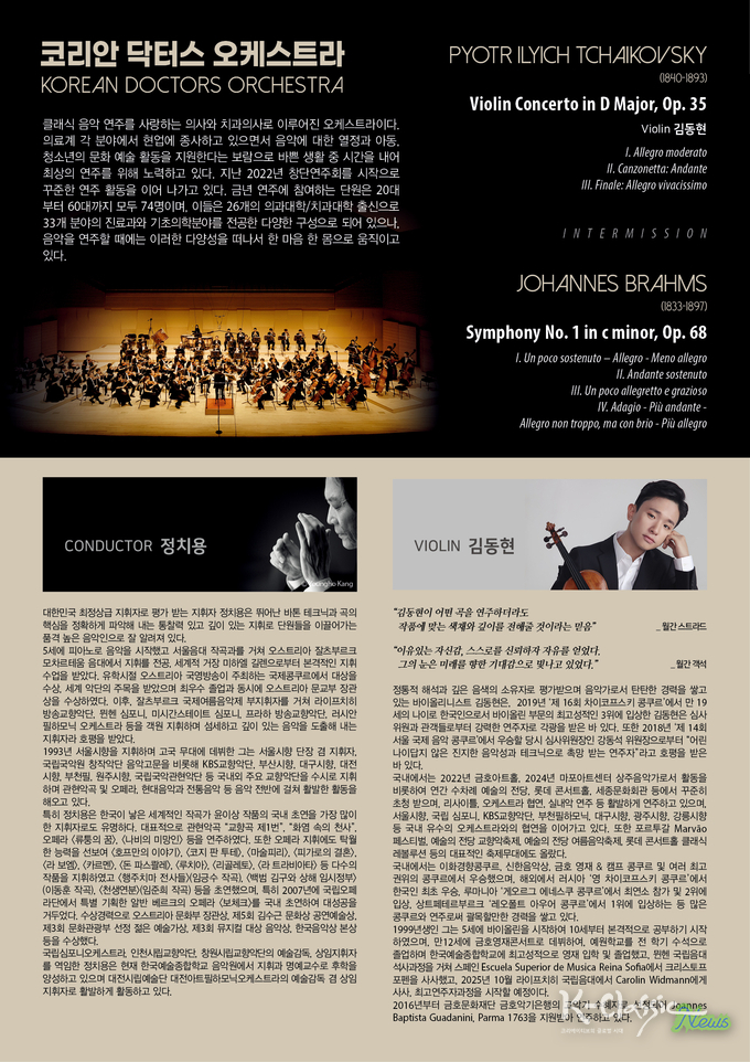 이번 연주회에서는 차이코프스키의 ‘바이올린 협주곡 D장조, Op.35’와 브람스의 ‘교향곡 제1번 c단조, Op.68’가 연주된다. 1부에서는 김동현이 차이코프스키 특유의 서정적 선율과 격정적 감정을 섬세한 테크닉으로 선보이며, 2부에서는 브람스의 장대한 교향적 구조 속에서 KDO의 단단한 앙상블과 깊이 있는 사운드가 더해져 감동을 전할예정이다.