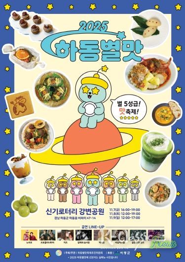 올해 축제는 ‘별처럼 반짝이는 하동의 맛’을 주제로, 지역의 대표 특산물과 별미를 한자리에 모은다. 하동 녹차와 재첩국, 하동한우, 하동감말랭이 등 전국 어디에서도 맛보기 힘든 하동의 농·특산물이 다채롭게 선보여지며, 지역 청년 상인과 주민이 함께 꾸미는 야간 푸드존, 버스킹 공연, 플리마켓도 운영된다.