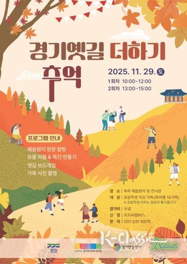 K-Classic News 기자 | 경기문화재단 경기역사문화유산원는 오는 11월 29일 토요일, 의주길에 위치한 파주 혜음원지 일대에서 초등학생 이상 자녀를 둔 가족을 대상으로 하는 역사 체험 프로그램 ‘경기옛길 더하기 추억’을 개최한다고 밝혔다.