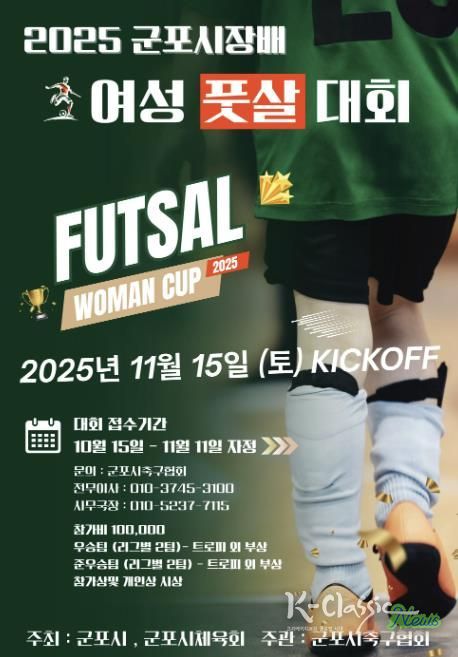 K-Classic News 기자 | 군포시는 여성 생활체육 참여 확대와 건전한 스포츠 문화 확산을 위해 ‘2025 군포시장배 여성 풋살대회’를 오는 11월 15일(토) 군포시 국민체육센터 축구장에서 개최한다.